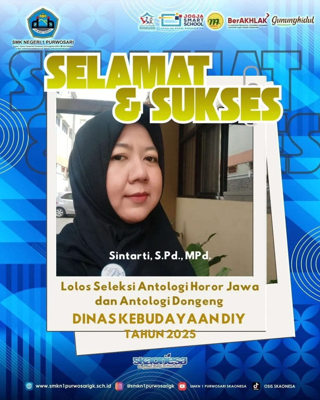 Guru SMKN 1 Purwosari kembali menorehkan prestasi membanggakan. Ibu Sintarti, S.Pd., M.Pd., guru mata pelajaran Bahasa Inggris, berhasil lolos dalam seleksi Antologi Horor Jawa serta Antologi Dongeng yang diselenggarakan oleh Dinas Kebudayaan DIY. Keberhasilan ini menegaskan kualitas beliau sebagai pendidik yang tidak hanya menguasai bidang pengajaran, tetapi juga aktif berkarya di dunia sastra.