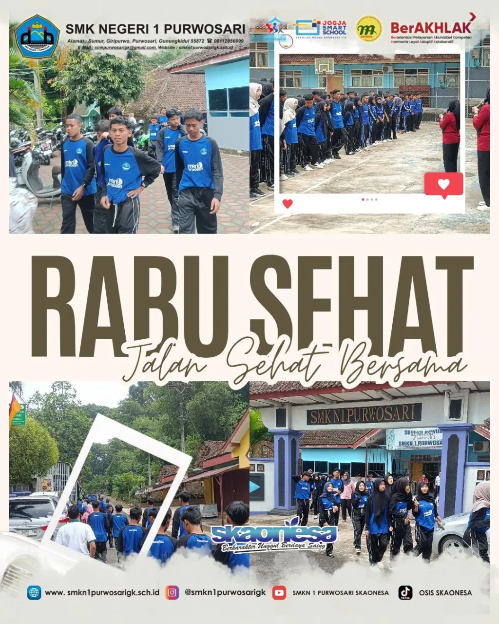 Pada hari Rabu, 15 April 2026, SMKN 1 Purwosari mengadakan kegiatan jalan sehat yang melibatkan seluruh warga sekolah. Kegiatan ini diikuti oleh siswa, guru, serta karyawan dengan penuh antusias. Sejak pagi hari, para peserta sudah berkumpul di halaman sekolah untuk memulai kegiatan bersama dalam suasana yang tertib dan penuh semangat kebersamaan.