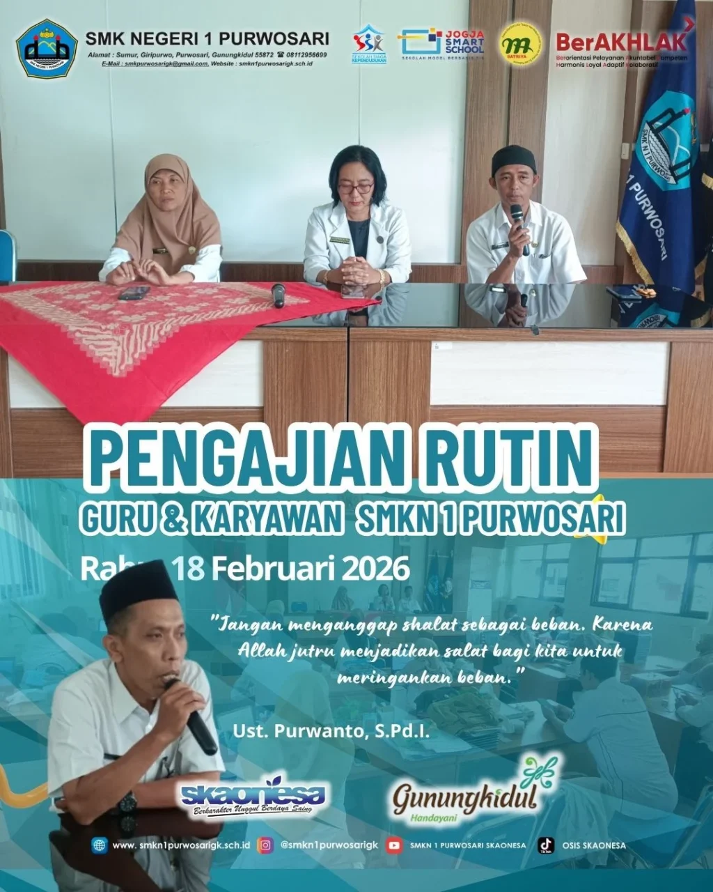 Menjelang datangnya bulan suci Ramadan 1447 H/2026 M, SMKN 1 Purwosari menggelar kegiatan pengajian yang diikuti oleh seluruh guru dan karyawan sekolah. Kegiatan ini dilaksanakan sebagai bentuk persiapan spiritual sekaligus upaya mempererat kebersamaan keluarga besar sekolah dalam menyambut bulan penuh berkah. Suasana khidmat dan penuh kekeluargaan terasa sejak awal acara hingga selesai.