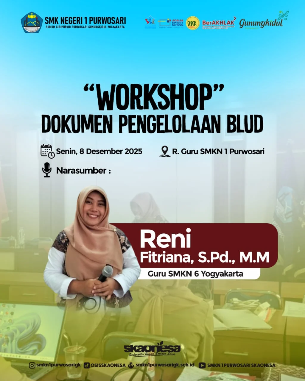 Workshop tersebut menghadirkan narasumber Ibu Reni Fitriana, S.Pd., M.M., dari SMKN 6 Yogyakarta, yang telah berpengalaman dalam penerapan sistem BLUD di satuan pendidikan. Kehadiran narasumber ini diharapkan dapat memberikan wawasan serta strategi yang tepat agar proses persiapan berjalan efektif dan sesuai regulasi. Peserta workshop terdiri dari sebagian guru dan karyawan SMKN 1 Purwosari yang nantinya akan terlibat langsung dalam proses pengelolaan BLUD.