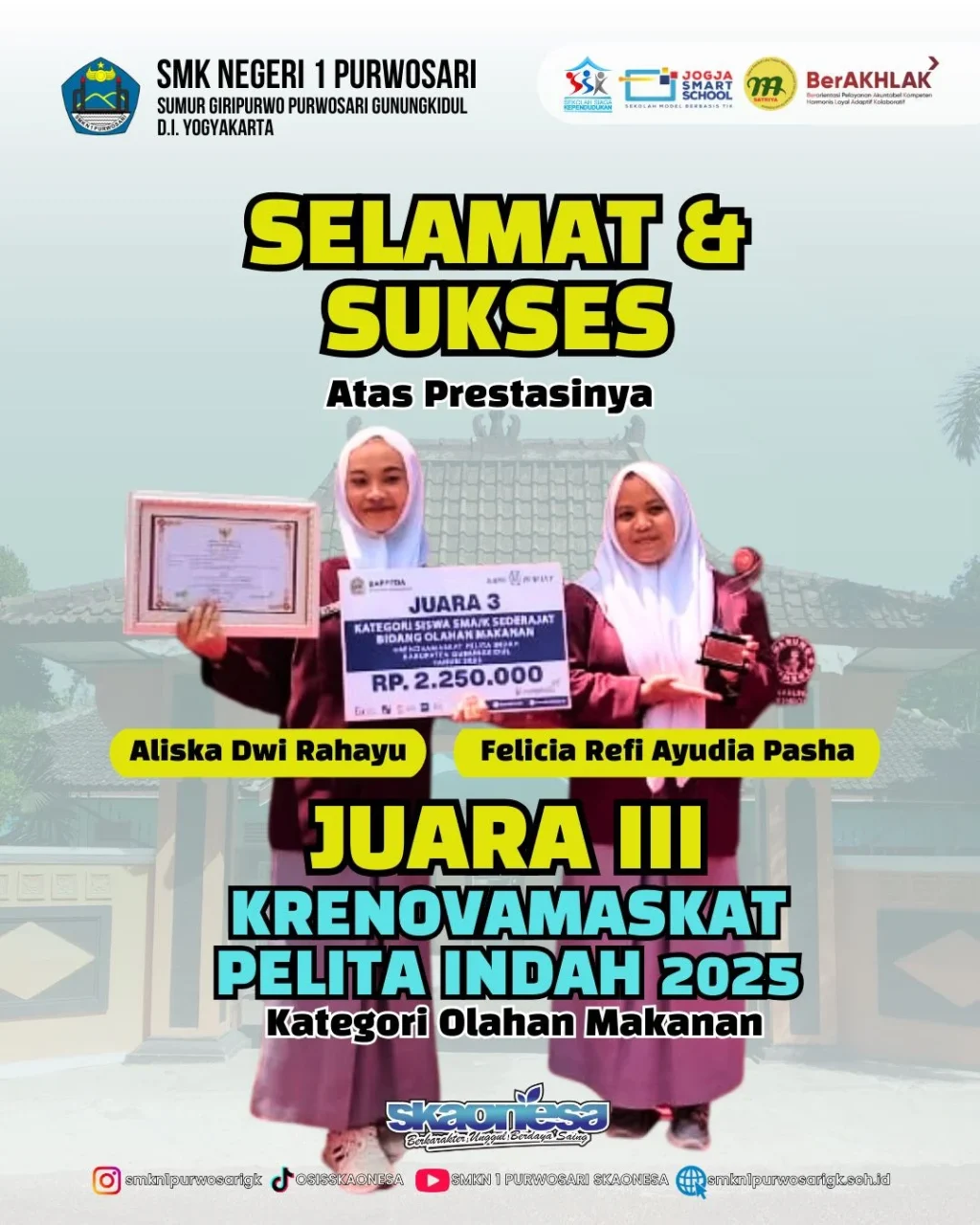 Siswa SMKN 1 Purwosari kembali menunjukkan prestasi gemilang dalam dunia kuliner dengan meraih juara ketiga pada ajang KRENOVAMASKAT Pelita Indah Tahun 2025. Ajang bergengsi ini merupakan wadah kreativitas dan inovasi di bidang masakan, yang diikuti oleh berbagai sekolah menengah kejuruan dari seluruh daerah. Kemenangan ini menjadi bukti nyata bahwa potensi dan kompetensi siswa SMKN 1 Purwosari patut diperhitungkan di kancah regional.