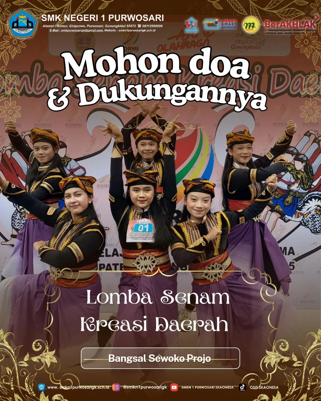 SMKN 1 Purwosari kembali menunjukkan semangat dan kreativitas siswanya dengan mengirimkan perwakilan dalam Lomba Senam Kreasi Daerah yang dilaksanakan pada Kamis, 23 Oktober 2025. Kegiatan ini berlangsung di Bangsal Sewoko Projo, Kabupaten Gunungkidul, dan diikuti oleh berbagai sekolah menengah dari wilayah sekitarnya. Acara ini bertujuan untuk melestarikan budaya daerah sekaligus menumbuhkan semangat sportifitas dan kebugaran jasmani di kalangan pelajar.