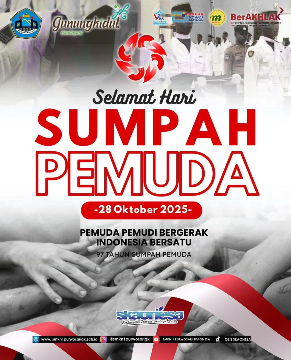 Dalam rangka memperingati Hari Sumpah Pemuda ke-97 yang jatuh pada tanggal 28 Oktober 2025, SMKN 1 Purwosari menyelenggarakan upacara bendera di lapangan sekolah. Upacara tersebut diikuti oleh seluruh guru, karyawan, serta seluruh siswa dari berbagai jurusan di SMKN 1 Purwosari. Suasana pagi itu terasa khidmat dan penuh semangat nasionalisme, terlihat dari antusiasme peserta upacara yang mengenakan seragam lengkap serta menjaga ketertiban selama kegiatan berlangsung.