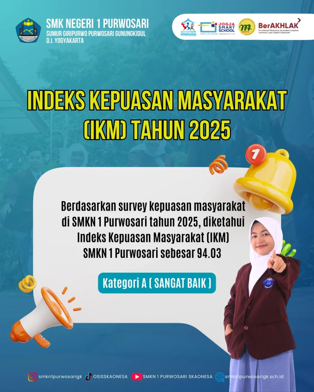 Berdasarkan hasil survei yang telah dilakukan, SMKN 1 Purwosari berhasil meraih Indeks Kepuasan Masyarakat (IKM) sebesar 94,03. Nilai tersebut menempatkan sekolah ini dalam kategori pelayanan “Sangat Baik”, sesuai dengan kriteria penilaian standar nasional. Pencapaian ini merupakan bukti nyata bahwa pelayanan yang diberikan oleh sekolah semakin diapresiasi oleh siswa, orang tua, dan masyarakat luas.